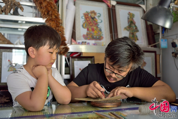 “這是北京顧客定制的作品”,日前,在樂亭皮影雕刻藝人吳文志的工作室,筆者看到了一組以景物為主題的皮影作品,惟妙惟肖的圖案顯示出精湛的刀筆工藝?!耙郧熬褪窍胧刈±陷吶肆粝碌乃囆g,現在咱也成了職業皮影雕刻人?!眳俏闹菊f,在剛剛過去的夏季旅游旺季,他出售皮影雕刻作品收入近7萬元。