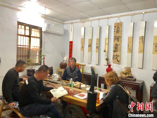 澮濱書院、集賢居……走進時莊村,構思精巧的各類民俗建筑立即吸引了記者的目光。屋外小橋流水、茂林修竹,屋內則有人手捧書卷,或在古琴和碑拓中神游,濃厚的文化氣息包裹著小村莊?!包S河泛濫井淤淹,土覆村莊水浸園。下半除污追朔漢,上端考古不祥年……”走進“詩詞之家”,滿墻的詩詞透露著主人的文化修養。這里是由時莊村書法家馬德民、馬德運、馬德俊利用民居改建的書畫院,廣受好評。