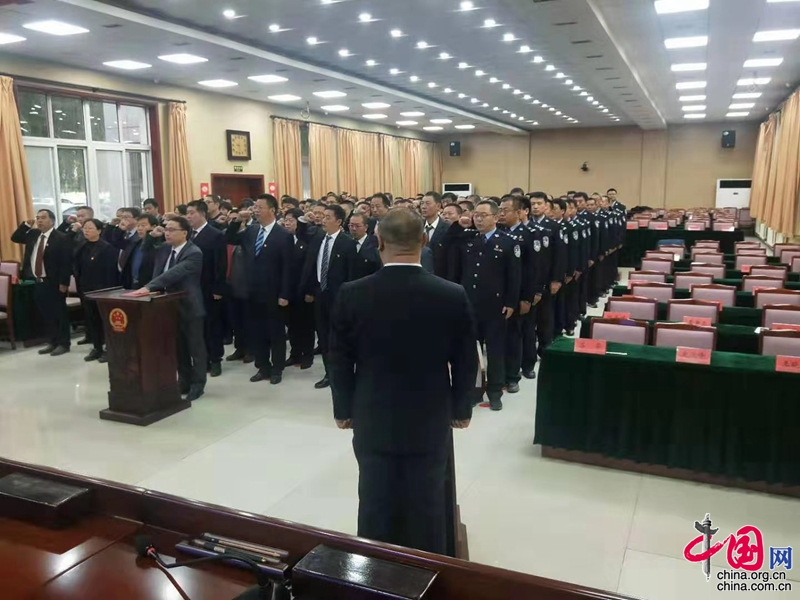 為進一步引導樂亭縣政府各部門及廣大領導干部增強憲法意識,自覺維護憲法權威,嚴格落實憲法宣誓制度,全面推動領導干部樹立法治精神、依法履職盡責,根據《中華人民共和國憲法》規定和《唐山市人民政府實施憲法宣誓制度操作規程(試行)》等要求,11月17日上午,樂亭縣在縣委會議中心舉行了憲法宣誓儀式,宣誓儀式由縣政府副縣長陳亮主持并監誓,由縣政府辦公室副主任宣讀了任免文件,2019年1月至2019年8月由縣政府任命的24個部門和單位的132名工作人員依法進行了憲法宣誓。