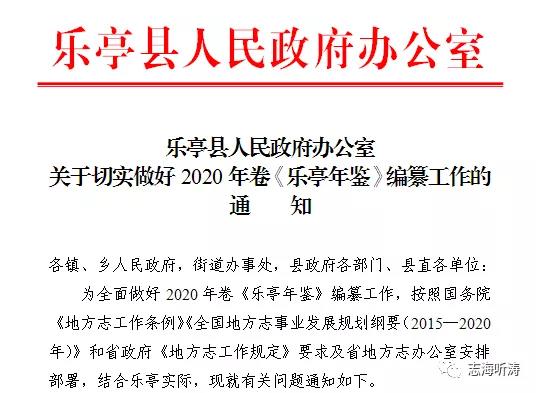 2019年12月16日,樂亭縣人民政府辦公室印發《關于切實做好2020年卷〈樂亭年鑒〉編纂工作的通知》?!锻ㄖ芬蟾骷壐鲉挝灰叨戎匾?,充分認識年鑒編纂工作的重要意義;要夯實責任,努力提高年鑒編纂質量;要及早安排,確保按時完成編纂任務。對相關欄目按照機構改革后的單位設置進行了調整,對地情書、村鎮志、家譜的編纂及地理標志證明商標的申報工作進行了提示。對報送撰稿人員名單及聯系方式及年鑒稿件(電子版、紙質版)做出了具體要求。樂亭縣地方志辦公室年鑒編纂人員將加快編修進度,力爭2020年底前《樂亭年鑒(2019)》《樂亭年鑒(2020)》兩部年鑒高質量出版發行。