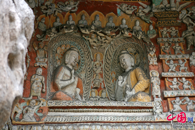 第9窟、10窟為雙窟,約建鑿于太和八年(484),完工于十三年(489)。它是一組前后室結構、具有漢式殿堂布局形式的雙窟。窟外壁崖面殘存7個長方形梁槽,與地面柱礎穴相對應,屬遼代前木構建筑遺跡??唛T列楹柱,面各三間,間距相同。柱身雕刻千佛,柱體漸上漸細,柱頭刻皿板、櫨頭、欄額等部件,柱下鐫須彌座及馱塔的大象、獅子。兩窟前室鑿有甬道相通??邇人谋诜謱硬箭?,最下層浮雕長卷式故事圖及供養人行列。第9窟主像雕釋迦,第10窟主像為彌勒菩薩,這是云岡中期新見的主像組合。