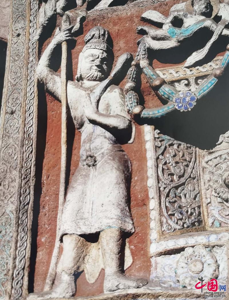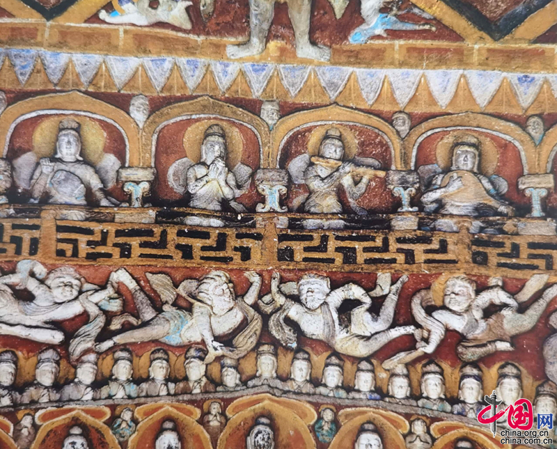 從這組天宮伎樂列龕中,我們能看到象征天宮的龕門前設置寒風濃郁的勾欄,即《金碑》所謂“色楯連延,則天皇彌勒之宮”。龕門內各有一天人或舞或樂,具有龜茲、涼州樂舞特色。列龕下為逆發形飛天和供養天眾。