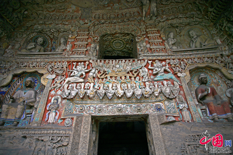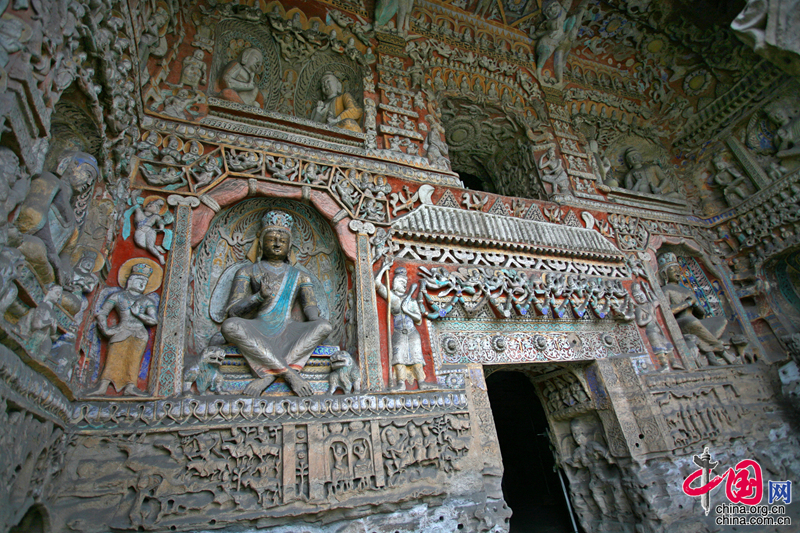 第9窟、10窟為云岡石窟中期的作品。中期建設,正處于一個民族變革、文化更新、繼往開來的階段。一方面西來之風不斷,胡風胡韻依然濃郁,占據有主導地位;另一方面,中華傳統勢力逐漸抬頭,漢式建筑、服飾、雕刻技藝和審美情趣逐漸顯露。