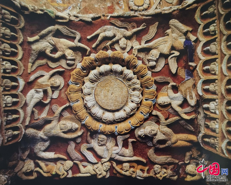 這組飛天托蓮像中,有二重大蓮花,外層十五瓣,內層十二瓣,呈放射狀綻開。八身飛天頭梳高發髻或剃發形,相間穿行,圍繞蓮花旋轉。他們或張臂滑翔,或揮手托蓮,或吸腿或縱身,姿態舒展,自由奔放。