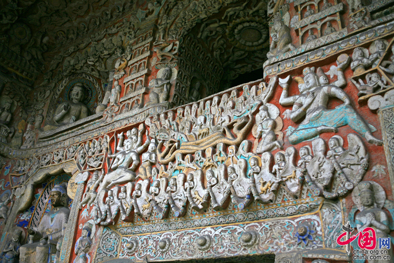 在第10窟前室北壁,我們可以看到,兩座五級塔柱之間開有尖楣圓拱龕形明窗。下端拱門門楣雕刻五枚蓮花門簪,底襯環形纏枝忍冬紋,繁而不縟。其間淺浮雕化生童子像。明窗與拱門之間是層巒疊嶂的須彌山,山間二龍交纏,山腰有茂密的林木和競奔的動物,動靜結合,虛實相間,裝飾氛圍濃郁。山體兩側,三頭四臂手托日月的阿修羅天和五頭六臂手持弓箭與日月的阿修羅天,單腿盤坐。