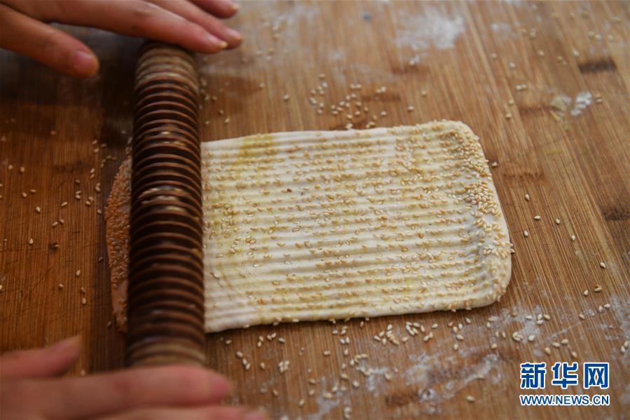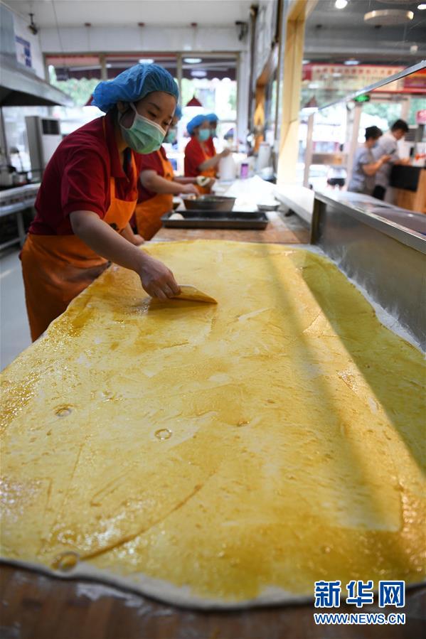 6月9日,工作人員在河北正定縣曹狀元燒餅店進行搟片作業。新華社發(陳其保 攝)
