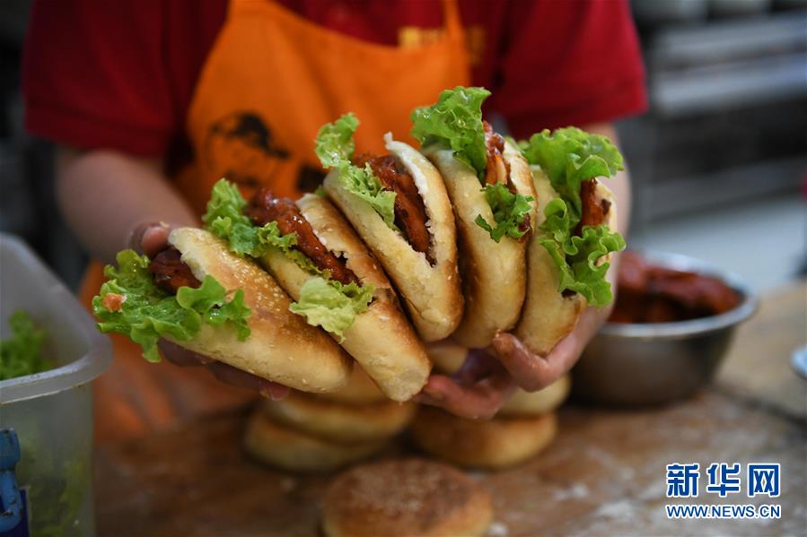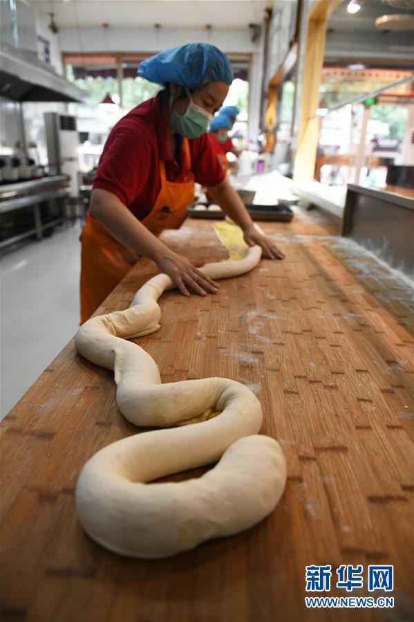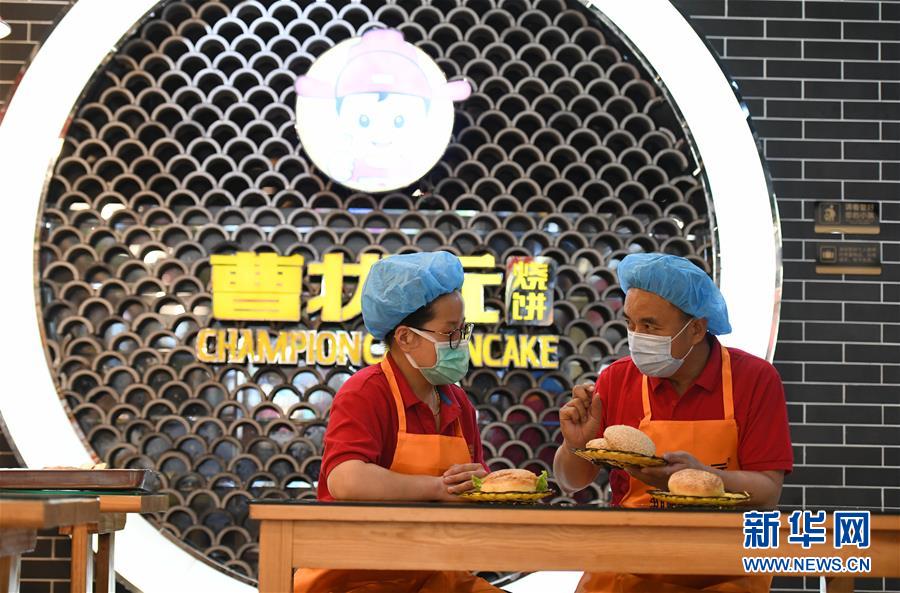 6月9日,工作人員在河北正定縣曹狀元燒餅店制作燒餅。新華社發(陳其保 攝)