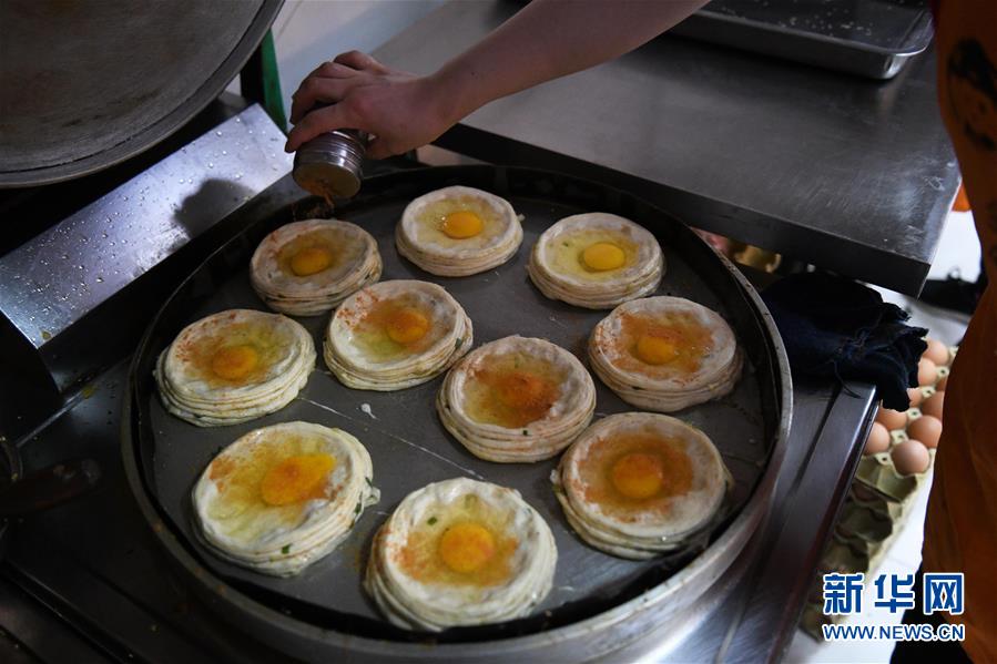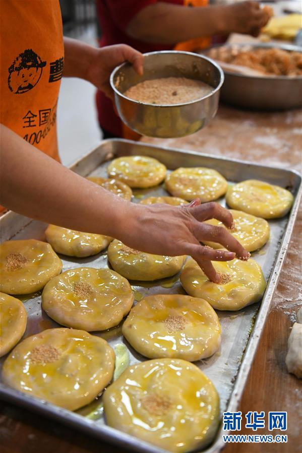 6月9日,工作人員在河北正定縣曹狀元燒餅店給正在烤制的燒餅加調料。新華社發(陳其保 攝)