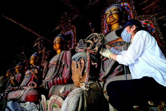 ▲6月8日,工作人員對奉國寺的彩繪泥塑進行保護修復。記者姚劍鋒攝