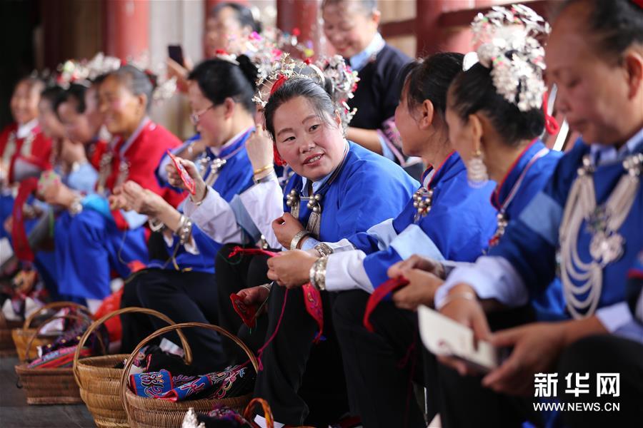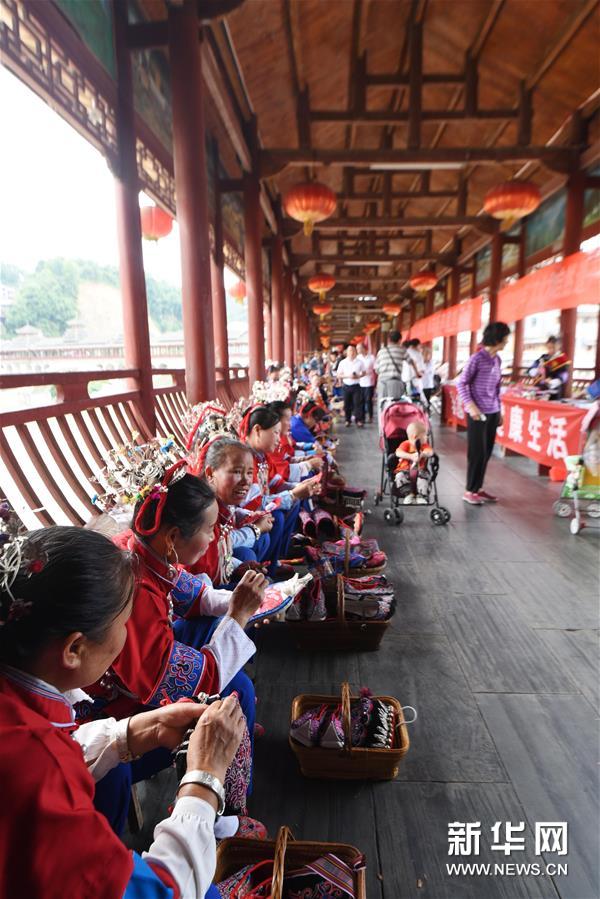 6月11日,繡娘們在貴州省錦屏縣三江鎮赤溪坪風雨橋進行刺繡技藝展示。楊曉海 攝