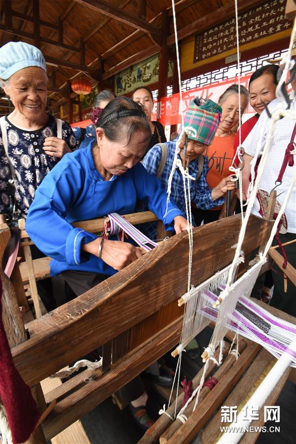 6月11日,一名婦女在貴州省錦屏縣三江鎮赤溪坪風雨橋展示織布技藝。楊曉海 攝