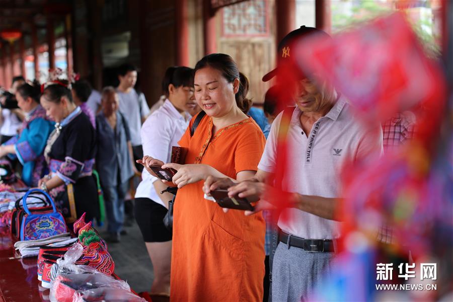 6月11日,人們在貴州省錦屏縣三江鎮赤溪坪風雨橋參觀刺繡制品。楊曉海 攝
