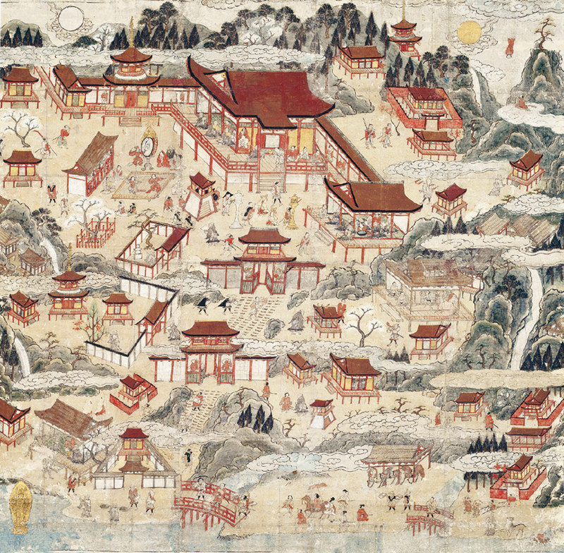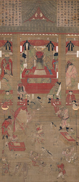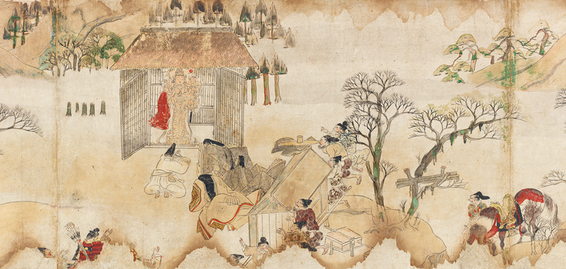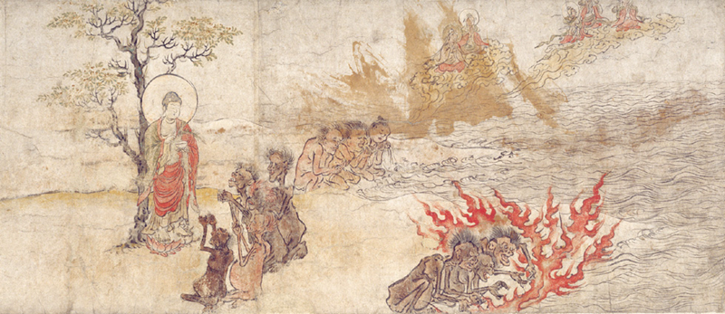 六道,指地獄、餓鬼、畜生、阿修羅、人、天等六個輪回的世界;而描繪六道世界的繪畫稱為六道繪?!皭汗聿菁垺闭敲枥L了六道中的餓鬼世界。平安時代后期,末法思想盛行,人們對于六道的關心日漸提高,本作就是在這樣的歷史背景下所產生。這件藏于京都國立博物館的文物講述的是救濟餓鬼的故事。
