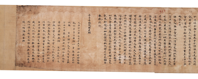 本卷為玄昉于天平十三年(公元741年)七月十五日的盂蘭盆會中,為祈愿圣武天皇、元正太上天皇、光明皇后圣壽無疆,皇太子、諸親王、文武百官、天下百姓盡忠行孝,以及拯救沉淪于于三惡道(地獄、餓鬼、畜生道)中的眾生,而發愿抄寫的《千手千眼陀羅尼經》一千卷中的一卷,也是現存僅有的一卷。