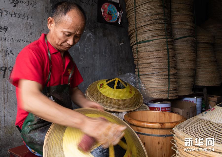 6月22日,在中方縣中方村,村民給斗笠刷油。新華社記者 陳思汗 攝