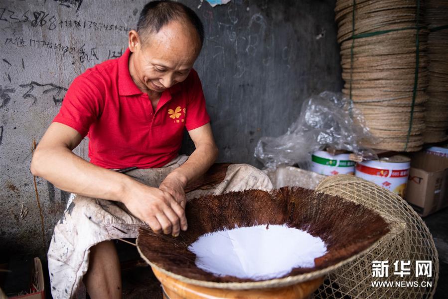 6月22日,在中方縣中方村,村民為斗笠墊棕。新華社記者 陳思汗 攝
