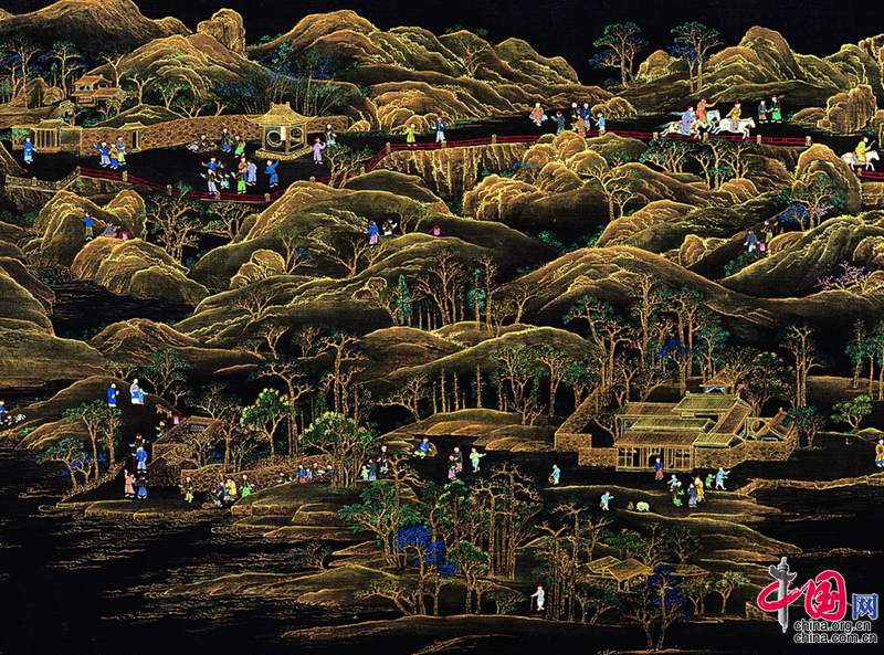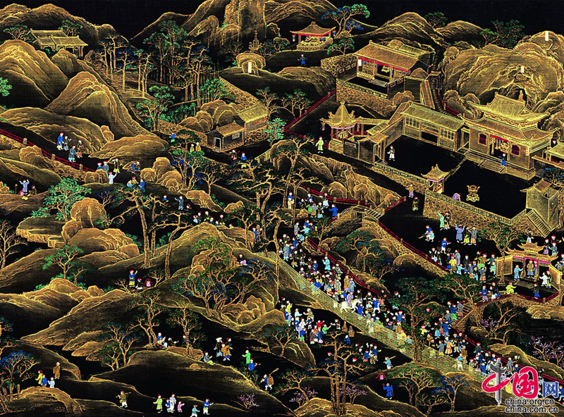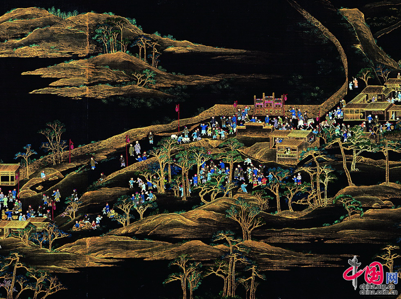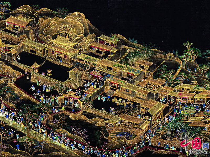 清無款《萬笏朝天圖》卷,為磁青絹地金碧山水人物畫長卷,卷高56.3厘米,卷長17米多。畫面由蘇州城郊開始,以城西天平山為中心展開,連接支硎山、靈巖山一帶的名勝古剎。觀音院、放鶴亭、聽雪閣、高義園、白云泉等著名景觀歷歷在目。畫卷色彩富麗,氣勢恢宏,將蘇州城的山川景致、市井風俗和官民盛大的迎接乾隆皇帝御駕的場景栩栩如生的再現于17米的長卷之上。卷首鈐有“宣統御覽之寶”印璽,為清宮舊藏。