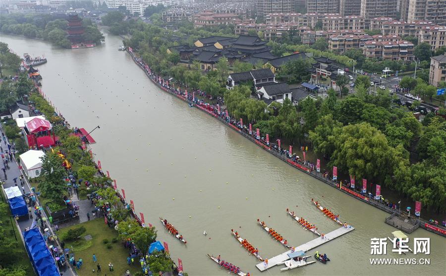 6月23日拍攝的江蘇省淮安市第一屆大運河龍舟賽的比賽現場(無人機照片)。新華社發(趙啟瑞 攝)