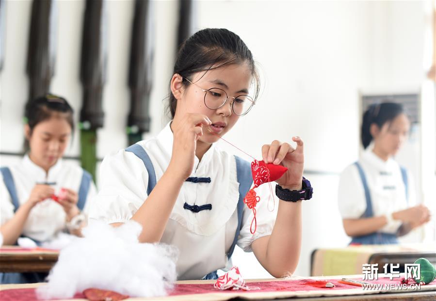 6月23日,浙江省諸暨市山下湖鎮中心小學六年級學生在學習制作香囊。新華社記者 韓傳號 攝