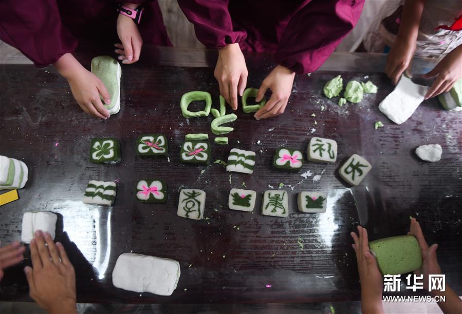 6月23日,浙江省湖州市吳興區織里鎮軋村小學學生在“民俗學堂”制作特色花糕。新華社記者 徐昱 攝