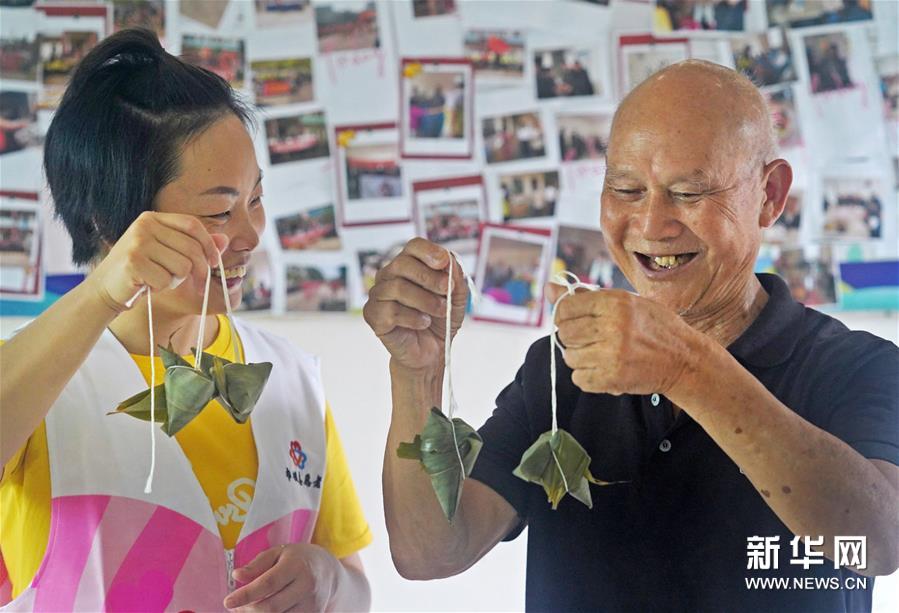 6月23日,在江西省南昌縣三江鎮一家敬老院,志愿者(左)和老人一起展示包好的粽子。新華社記者 萬象 攝