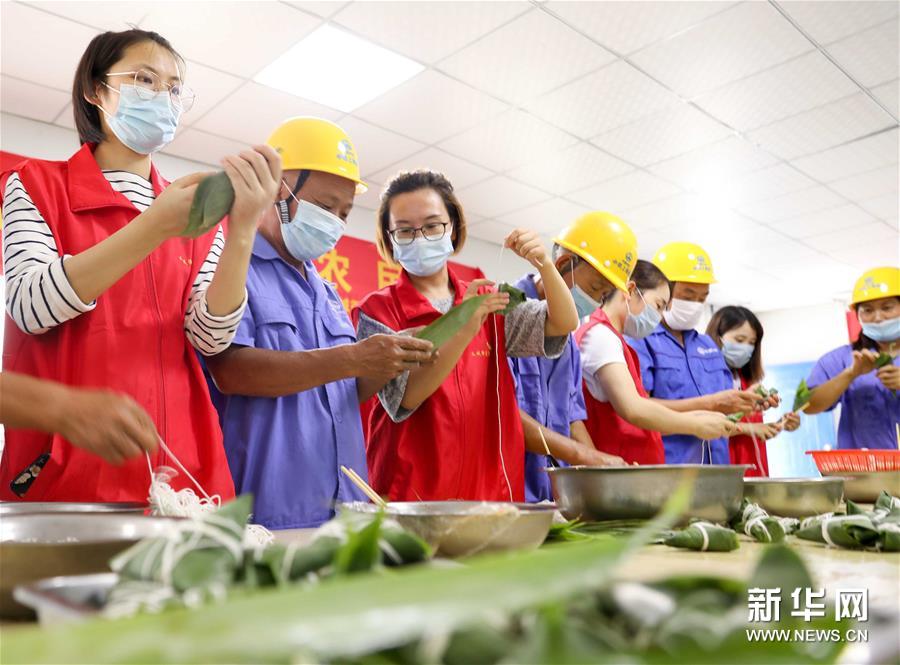 6月23日,安徽省合肥市義城街道的志愿者來到中鐵上海局合肥市軌道交通項目部,與地鐵建設者一起包粽子。新華社記者 曹力 攝