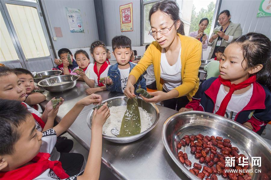 6月23日,山東省青州市王府街道劉井小學老師指導學生包粽子。新華社發(王繼林 攝)