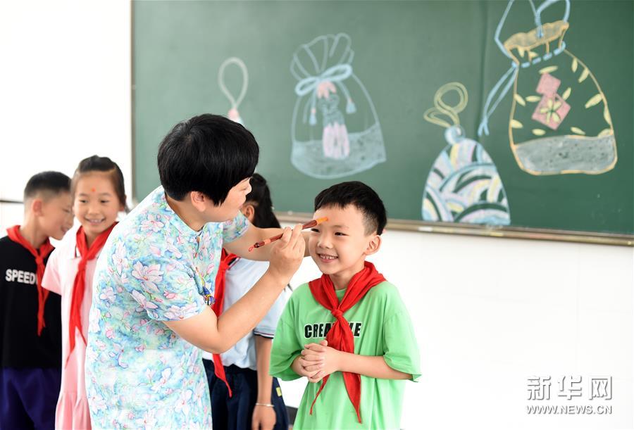 6月23日,浙江省諸暨市山下湖鎮中心小學校長王國英為一年級學生點雄黃。新華社記者 韓傳號 攝
