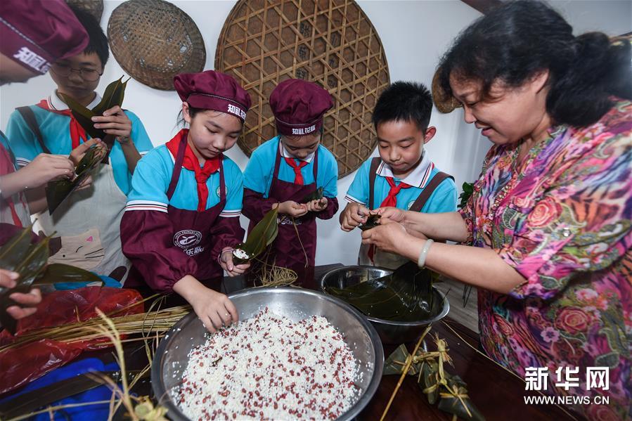 6月23日,浙江省湖州市吳興區織里鎮軋村小學學生在“民俗學堂”跟當地村民學習包粽子。新華社記者 徐昱 攝