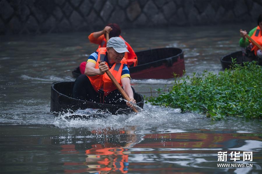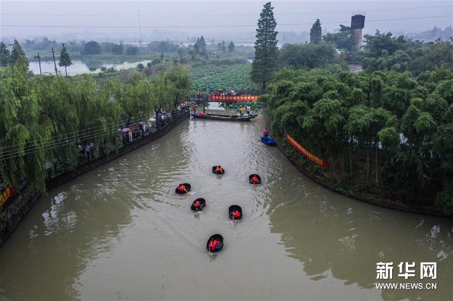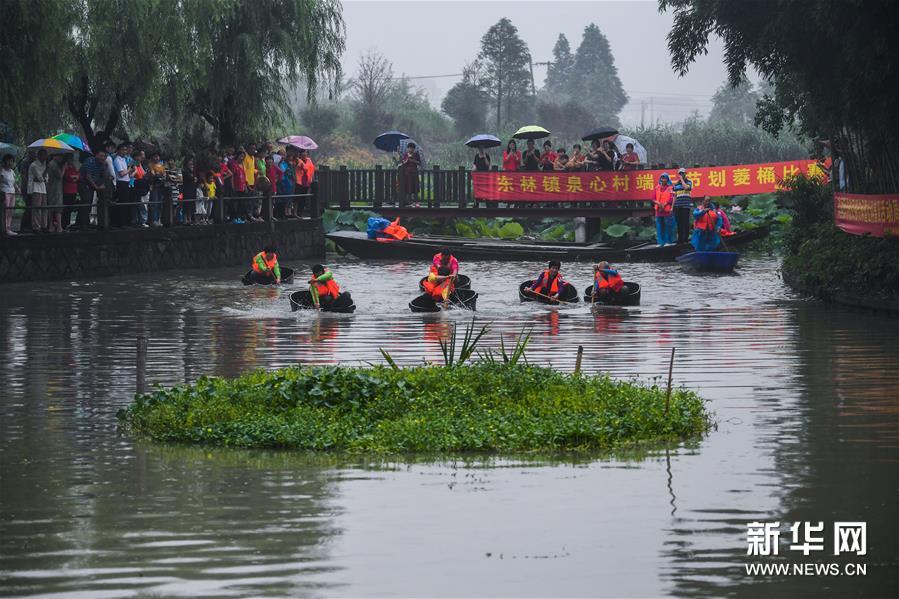 6月23日,東林鎮村民在泉心村荷花池參加端午劃菱桶趣味活動。新華社記者 徐昱 攝