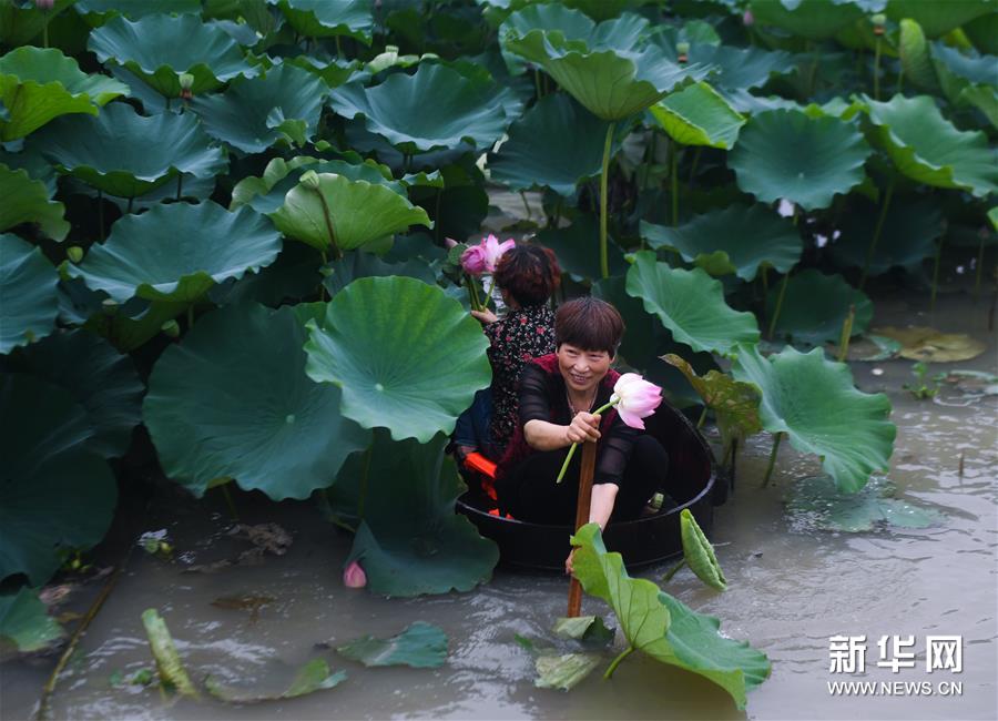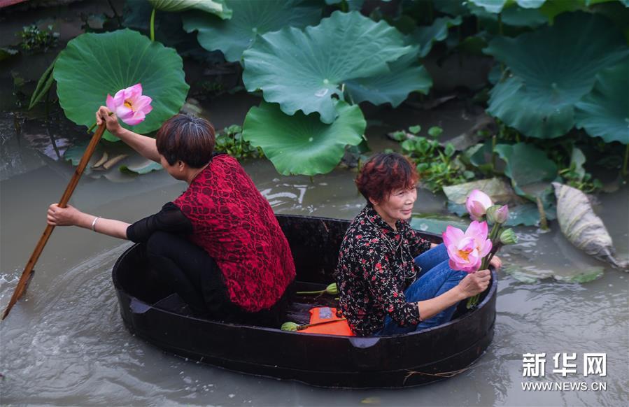 6月23日,東林鎮村民劃著菱桶采收荷花和蓮蓬。新華社記者 徐昱 攝