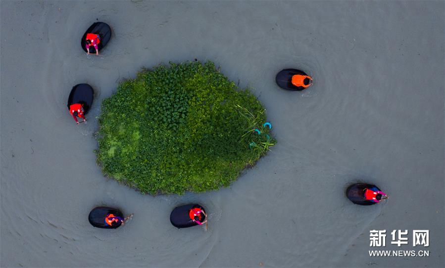 6月23日,東林鎮村民劃著菱桶采收荷花和蓮蓬(無人機照片)。新華社記者 徐昱 攝