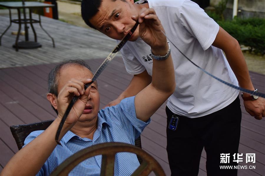 6月30日,朱生榮(左)和兒子朱強(右)在當晚電影開播前檢查膠片位置。新華社記者 鄭夢雨 攝