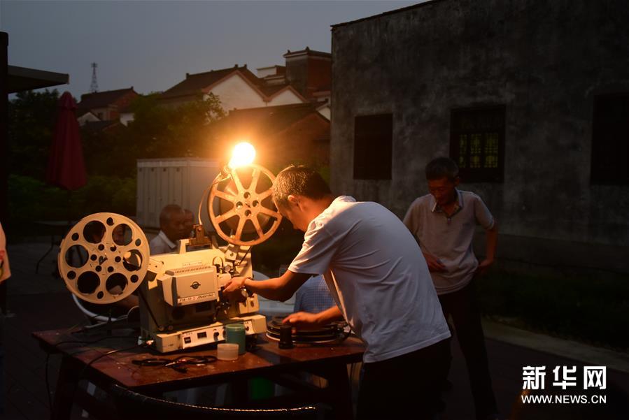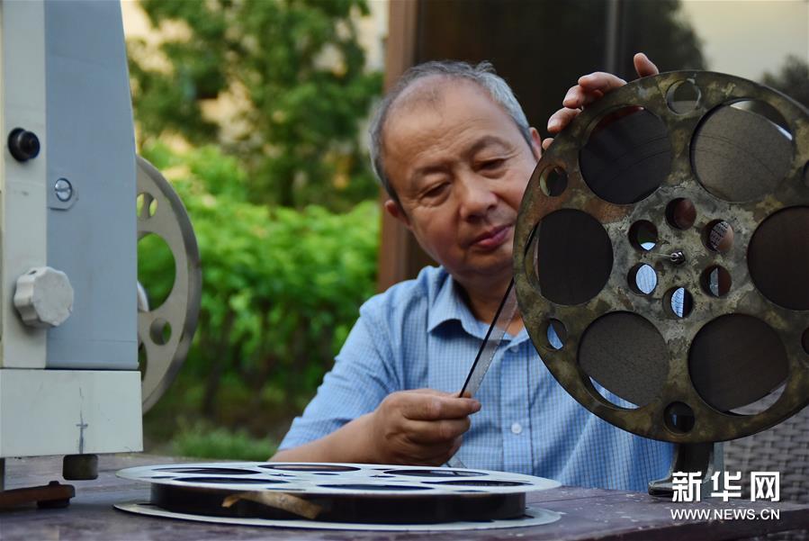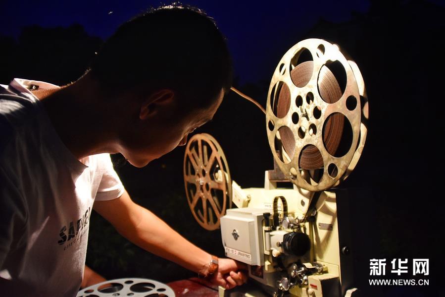 6月30日晚,電影放映中,朱強在更換膠片。新華社記者 鄭夢雨 攝