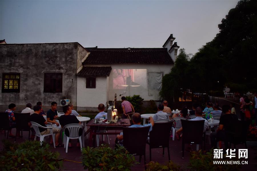 6月30日,天色漸暗,村民自發圍坐在廣場觀看電影。新華社記者 鄭夢雨 攝