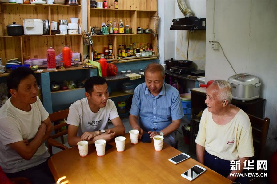 6月30日,第二代放映人朱文炳(左一)、第四代放映人朱強(左二)與第三代放映人朱生榮(右二)來看望第一代放映人王志華(右一)。新華社記者 鄭夢雨 攝