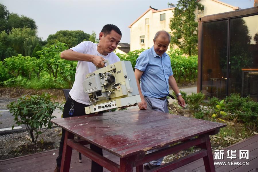 6月30日,朱生榮(右)和兒子朱強(左)攜帶放映設備來到馬鳴村將軍湖廣場。新華社記者 鄭夢雨 攝