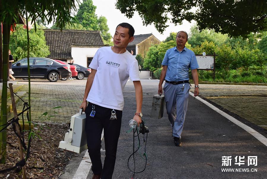 6月30日,朱生榮(右)和兒子朱強(左)在馬鳴村將軍湖廣場布置放映設備。新華社記者 鄭夢雨 攝