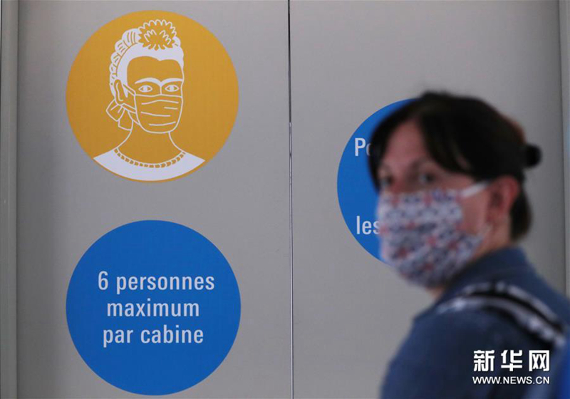 7月1日,法國巴黎蓬皮杜藝術中心的電梯上貼著“請佩戴口罩”和“最多6人乘梯”的標識。新華社記者 高靜 攝