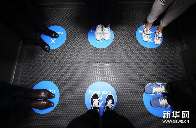 7月1日,法國巴黎蓬皮杜藝術中心的電梯內貼著保持安全距離的標識,每次乘梯不能超過6人。新華社記者 高靜 攝