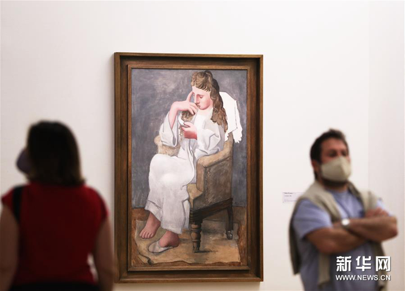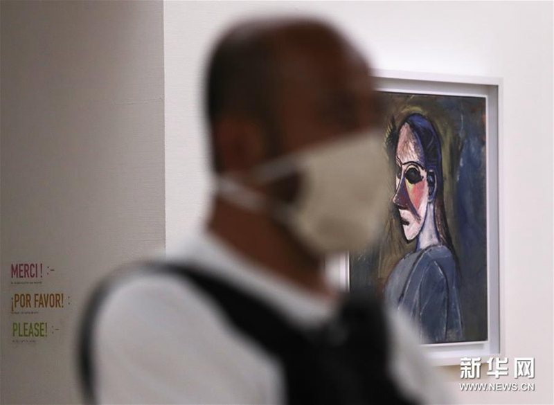 7月1日,一名戴口罩的參觀者在法國巴黎蓬皮杜藝術中心走過畢加索的畫作。因新冠疫情關閉的法國巴黎蓬皮杜藝術中心于7月1日重新開門迎客。目前,中心只開放6層的臨時展區和4、5層的現代藝術常設展區。參觀者需提前網上預約參觀時段,11歲以上參觀者須佩戴口罩,參觀過程中保持安全距離。新華社記者 高靜 攝