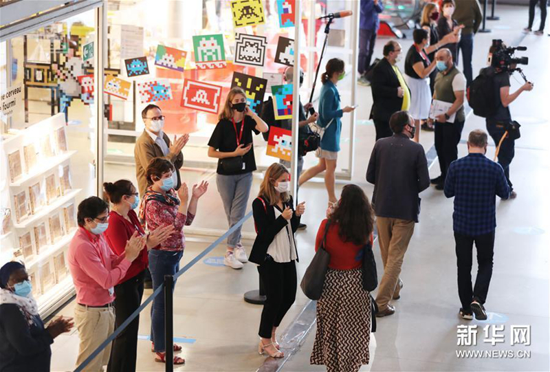 7月1日,法國巴黎蓬皮杜藝術中心的工作人員鼓掌歡迎參觀者。新華社記者 高靜 攝