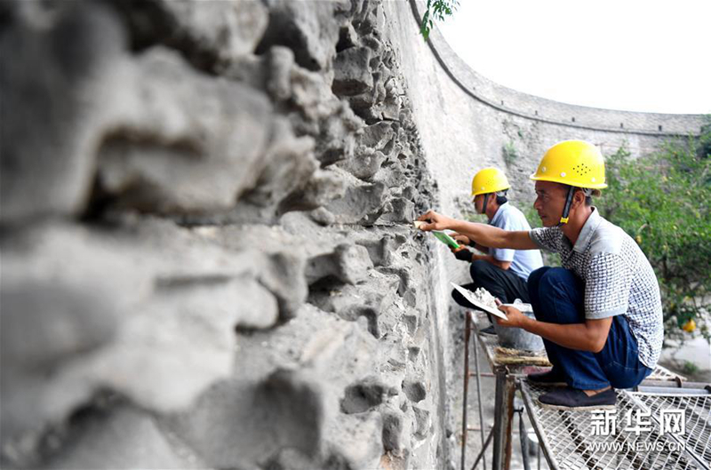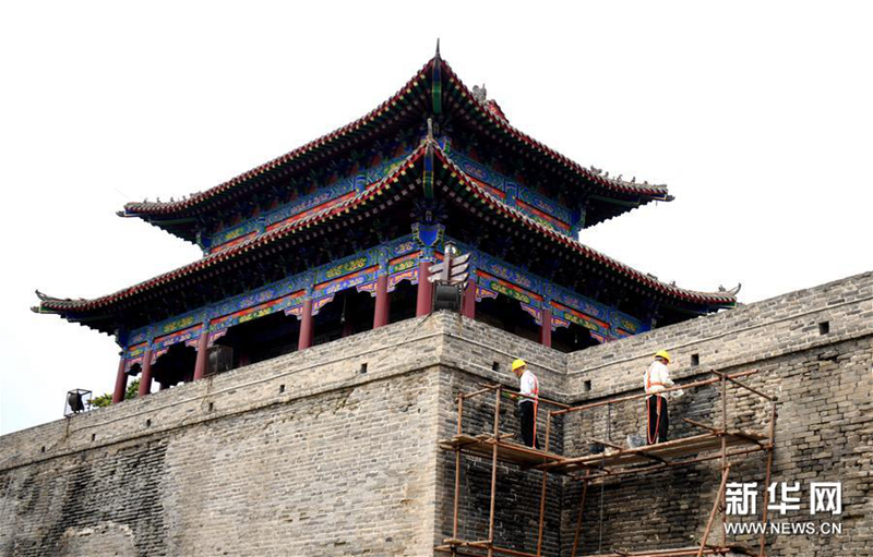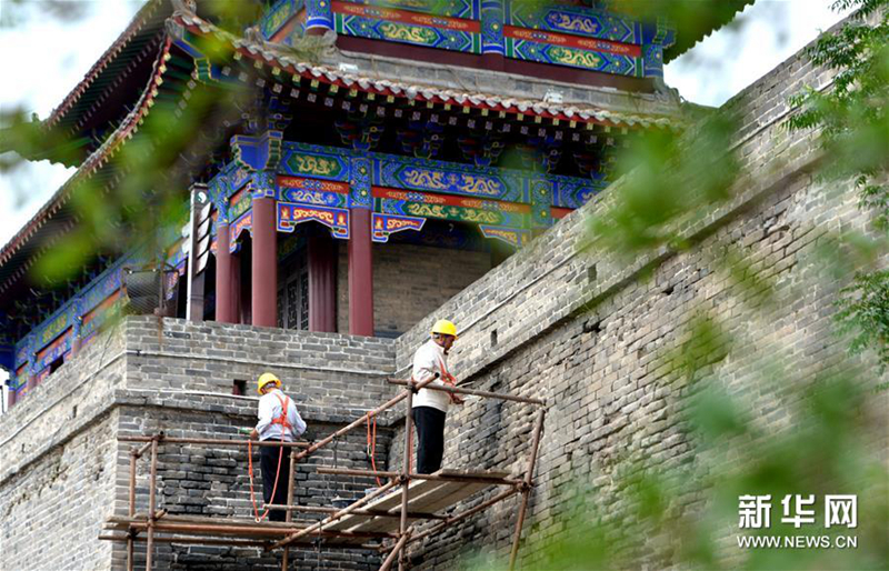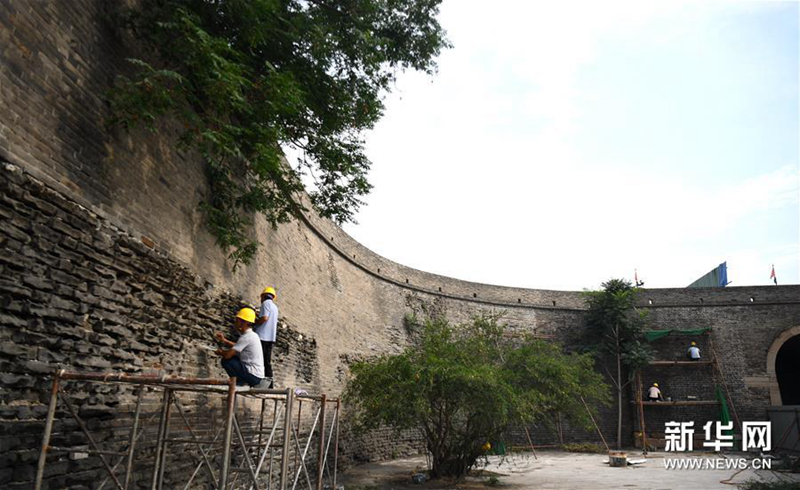 7月2日,工作人員在永年廣府古城修繕城墻。新華社記者 王曉 攝