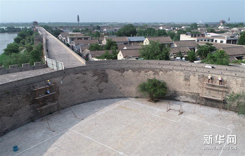 7月2日,工作人員在永年廣府古城修繕城墻(無人機照片)。新華社記者 王曉 攝