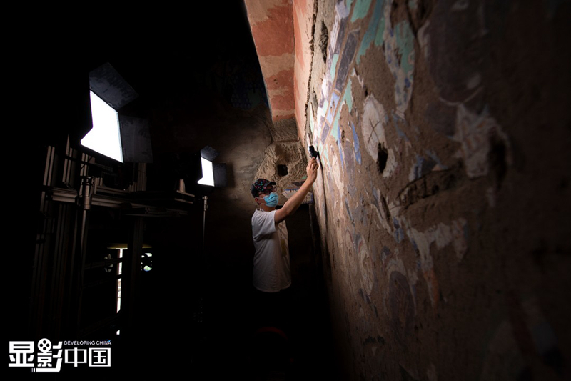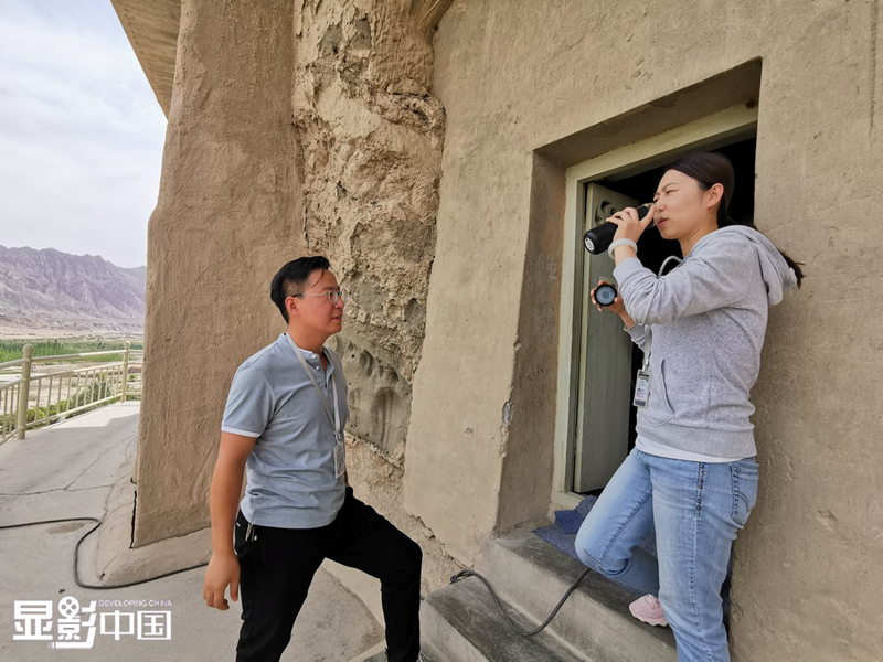 文物數字化的大部分工作需要在洞窟中進行,李博和團隊經常在洞窟一待就是一整天?!坝行┒纯叨緶囟缺仁彝膺€要冷,夏季比室外高得多,在里面待久了會讓人喘不過氣,非常難受?!崩畈┱f。圖為工作人員正在測量壁畫間距離,壁畫間距離不同,掃描設備調試也會不同。新華網 茹斯坦攝