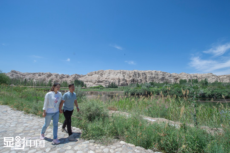 雖然工作辛苦,但李博有了意外的收獲。在單位組織的一次活動中,認識了賈文佳,那時候,李博還要參與克孜爾石窟申遺的籌備工作,白天在洞窟內掃描文物,晚上在辦公室整理資料,一度忙得不可開交?!爱敃r任務非常重,經常加班到凌晨。這里是野外,路燈少,擔心她的安全,每天都送回宿舍,慢慢地我倆開始了交往?!辟Z文佳對追求李博的經歷記憶猶新。圖為正午,天氣炎熱,賈文佳探望妻子李博,為她送水。新華網 茹斯坦攝