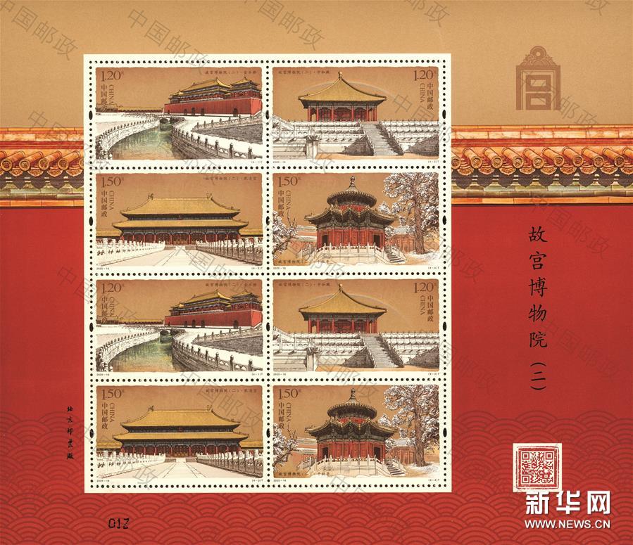 中國郵政于7月11日發行《故宮博物院(二)》特種郵票一套4枚,小型張1枚。郵票圖案名稱分別為:金水橋、中和殿、乾清宮、千秋亭,小型張圖案為故宮博物院平面示意圖。全套郵票面值為11.40元。2020年是紫禁城建成600年,又是故宮博物院成立95周年,故宮博物院推出精彩紛呈的文化活動,傳承弘揚中華優秀傳統文化。