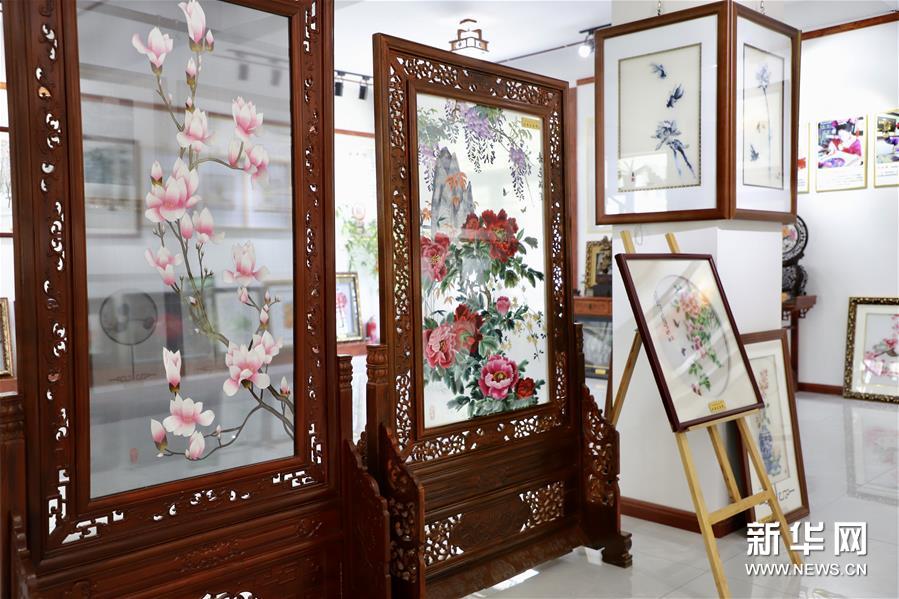 在北安市烏魚繡傳承展示館拍攝的北安烏魚繡作品(7月2日攝)。新華社發(徐凱鑫 攝)