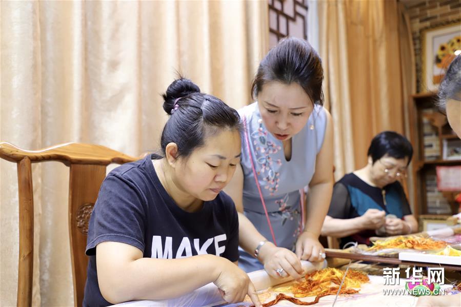 黑龍江省非物質文化遺產傳承人王春艷(中)在北安市烏魚繡傳承展示館內指導學員刺繡技巧(7月2日攝)。新華社發(徐凱鑫 攝)