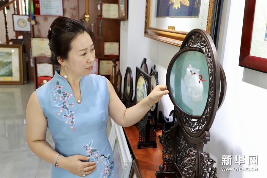黑龍江省非物質文化遺產傳承人王春艷在北安市烏魚繡傳承展示館介紹烏魚繡作品(7月2日攝)。新華社發(劉赫垚 攝)